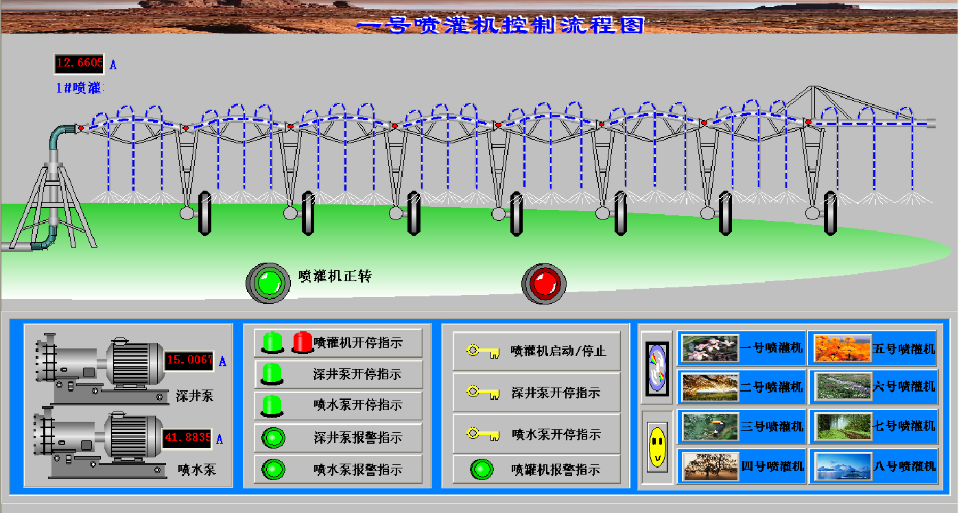 Adopting PLC control technology realizes the online automatic control and it possesses the function of safe protection overloading warning protection automatic adjustment function over water, water pressure flow over limit protection. The rainfall can be adjusted according to the walking pace of the sprinkler. It can sense the default precisely. The system is stable and reliable. One work can monitor several devices a time even without work; the device can be on automatically. When the machine doesn’t work well, the system can pop up the information and the operator is informed of examine and repairing certain parts of certain devices and can diagnose it automatically. All this are evidences of online automatic operation and breakthrough or industrial automatic control in agriculture irrigation devices.